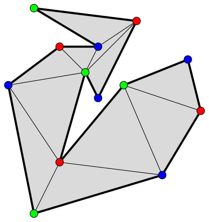 On place les caméras aux sommets de la couleur apparaissant le moins souvent. Ici, on a le choix entre le rouge ou le vert. L’algorithme nous donne une solution avec quatre caméras. Supposons que les caméras soient placées aux sommets rouges. Chaque triangle a exactement un sommet rouge. Donc, il est surveillé par la caméra placée en ce sommet. Ceci est vrai pour tous les triangles. On en conclut que les caméras rouges surveillent toute la galerie.