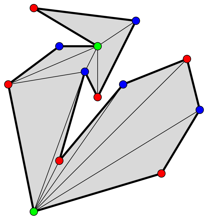 On colorie les sommets du polygone de trois couleurs, de telle sorte que les sommets de chaque triangle soient de couleurs différentes. (C’est toujours possible.)