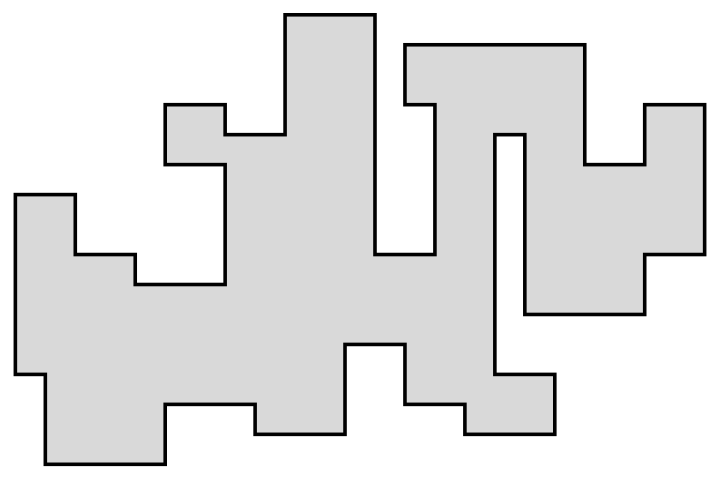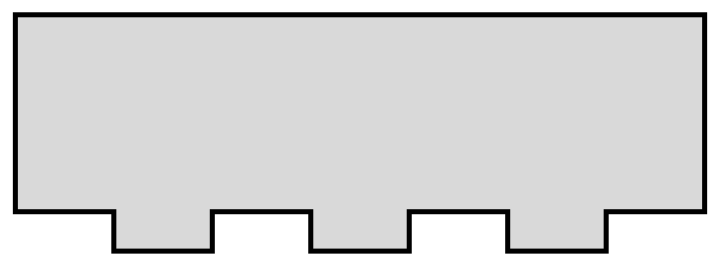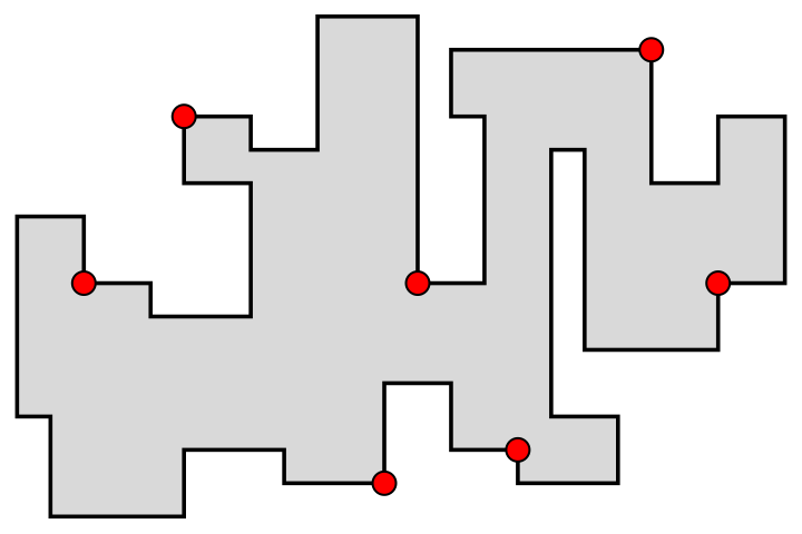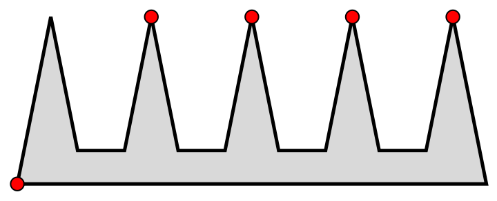 C’est une grande galerie rectangulaire avec des fenêtres sur une longueur. Les murs sont épais si bien que les fenêtres sont enfoncées. On veut surveiller toutes les encoignures des fenêtres. Sinon, une unique caméra suffirait à surveiller la galerie. On représente schématiquement la forme de la galerie incluant les encoignures de fenêtres par le polygone de la figure 13.