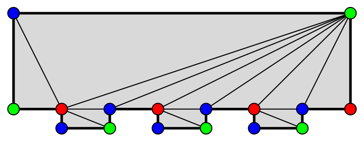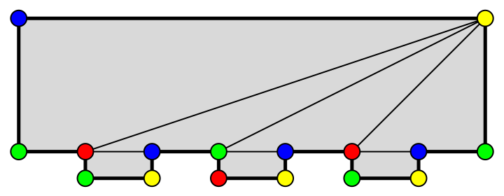 (Remarquons qu’on aurait pu allonger la galerie et ajouter des fenêtres.) Voici, à la figure 14, un découpage en triangles et un coloriage associé des sommets.