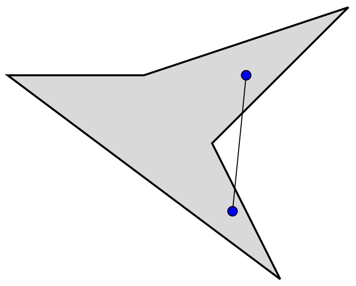C’est que les polygones réguliers sont convexes. Un polygone est convexe si, pour toute paire de points à l’intérieur du polygone, le segment les joignant est entièrement contenu dans le polygone. Notre première galerie n’était pas convexe. La galerie de gauche dans la figure 5 est convexe, alors que celle de droite ne l’est pas.