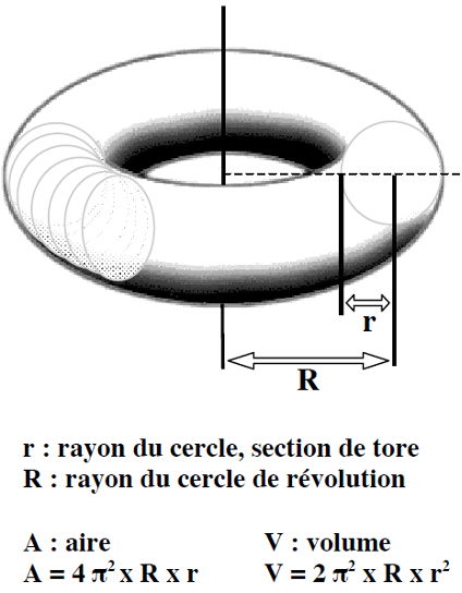 - La circonférence du cercle ayant engendré le tore est près de 113 centimètres. La circonférence du cercle de révolution de la chambre à air est près de 201 centimètres. Quel est le volume de la chambre à air ?