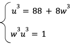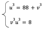 On obtient d’une part l’équation u3 = 88 + v3 (représentant le volume du grand cube) et, d’autre part, 3vux = 6x (représentant le volume du prisme découpé), ou encore vu = 2. En élevant au cube cette dernière équation, on voit qu’il suffit de résoudre pour v3 et u3 le système d’équations suivant :