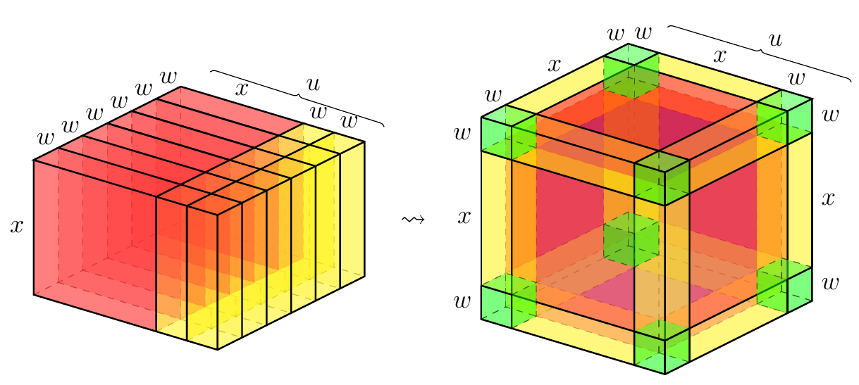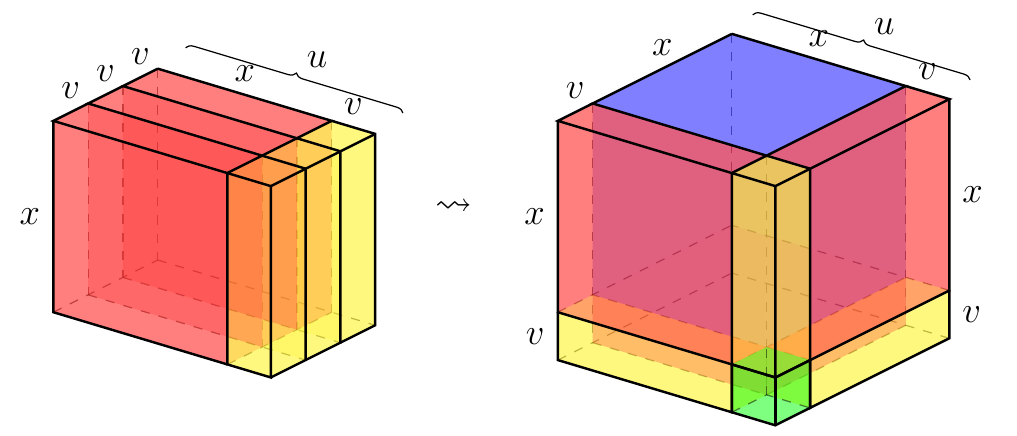 Revoici les grandes lignes de la résolution de x3 + 6x = 88 inspirée par la complétion du cube (Rouleau, 2016). Imaginons que 6x soit le volume d’un prisme dont la hauteur mesure x. (Figure 12) L’idée est de découper ce dernier prisme astucieusement en morceaux (jaunes et rouges) et de les coller au cube (bleu) dont le côté mesure x, puis de compléter le grand cube ainsi formé avec un petit cube (vert). Afin de déduire les mesures permettant ce découpage-collage, on pose v comme étant la mesure du côté du petit cube et u = x + v celle du côté du grand cube.