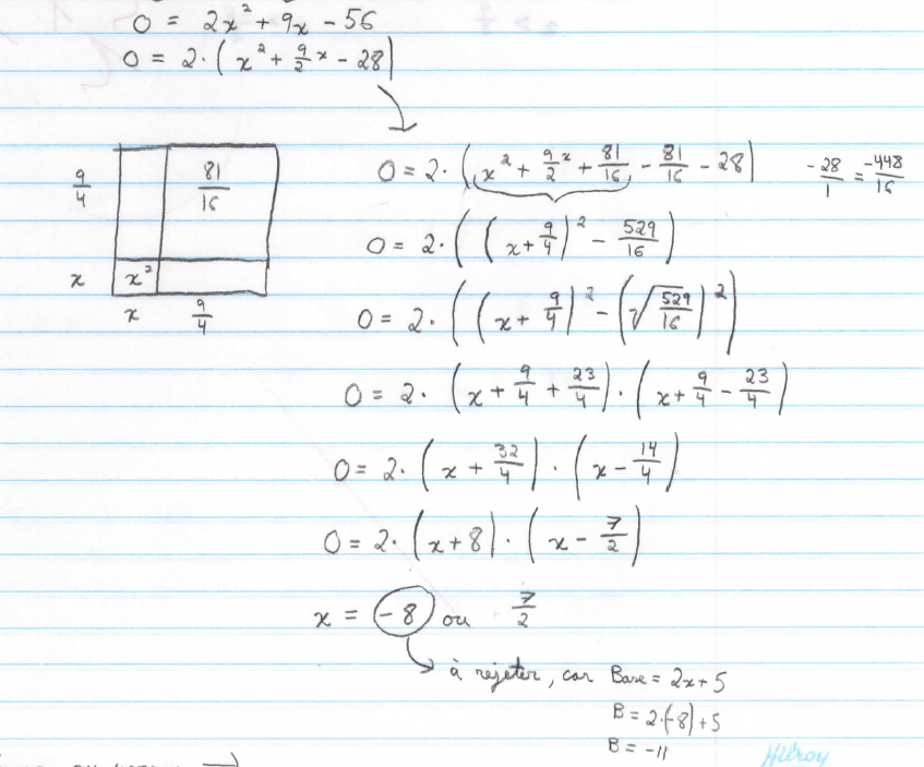 Il faut cependant oser se demander : cette expérience est-elle vraiment marquante pour certains élèves ? Je suppose que la plupart d’entre eux ne retiennent finalement que la procédure à suivre, c’est-à-dire une formule ou enchaînement de calculs à effectuer ; cette façon de faire est d’ailleurs probablement renforcée par les exemples et exercices (corrigés) proposés dans les cahiers et autres ressources disponibles sur le web qui répandent largement ce genre de recette instantanée pour « aider » les élèves. Cependant, je crois que l’analogie géométrique, si elle est présentée avec un peu d’enthousiasme aux élèves, peut laisser des traces, voire s’avérer signifiante, chez certains d’entre eux. Dans la figure 8, un élève illustre l’idée clef de la complétion du carré au cours de la résolution d’un problème dans le cadre d’une évaluation ; j’ose espérer qu’elle a servi d’ancrage pour déterminer le terme « 8116 ».