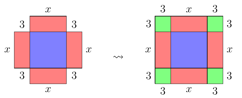 À ma connaissance, on doit à Al-Khowârizmî cette idée de « complétion du carré ». Dans The Algebra of Mohammed Ben Musa2, il avait proposé deux façons de l’illustrer pour l’expliquer ; l’une d’elles est celle que nous avons présentée, et l’autre consistait à diviser le rectangle d’aire 6x en quatre rectangles isométriques et de les juxtaposer à chaque côté du carré x2, puis de compléter les quatre coins du grand carré (figure 9).