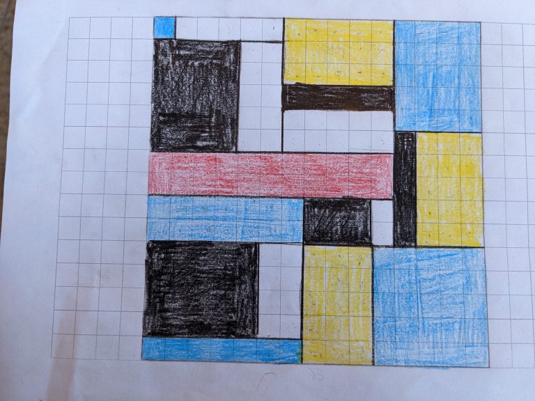 Un exemple concret que j’utilise en première secondaire est la création d’une œuvre d’art à la manière de Mondrian. Les élèves doivent respecter des contraintes mathématiques précises tout en produisant une œuvre inspirée de l’artiste. Pour réaliser leur œuvre, ils peuvent choisir :