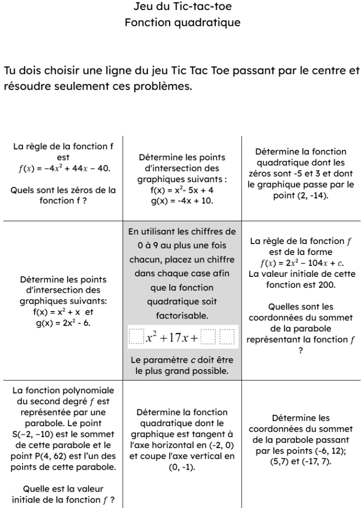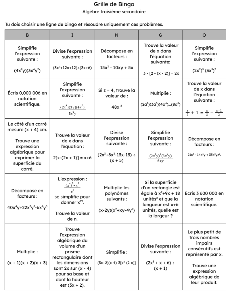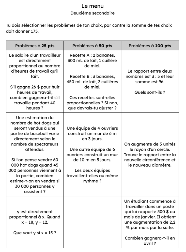 Chaque choix donné à l’élève renforce son engagement. Des exercices mathématiques présentés différemment permettent de travailler les concepts, mais en offrant des alternatives aux élèves. Voici quelques formats de travail allouant des choix : exercices présentés dans une grille de tic‑tac‑toe, exercices présentés dans un menu à pointage où l’élève doit atteindre une somme prescrite, exercices présentés dans une grille de bingo.