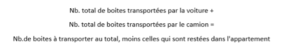 Dans ce problème, différentes grandeurs sont sollicitées : le nombre total de boîtes à déménager, le nombre de boîtes que chaque véhicule peut transporter, le nombre d’allers-retours des véhicules et le nombre de boîtes restantes à la fin de la journée2. Chaque véhicule transporte un même nombre de boîtes à chaque aller qui n’est pas le même pour la voiture et pour le camion. Ces nombres sont exprimés par une relation de comparaison « la voiture de tante Marie peut contenir trois fois moins de boites que le camion de l’oncle Richard » et on ne connait aucun de ces deux nombres. Des grandeurs non homogènes sont présentes dans le problème : huit allers-retours pour la voiture et sept allers-retours pour le camion. De plus, il ne faut pas oublier la boîte supplémentaire transportée sur le toit de la voiture. Constatons aussi que l’on infère que les boîtes sont équivalentes en taille, ce qui n’est pas toujours le cas dans la réalité. Pour la mise en équation, il faut gérer les grandeurs non homogènes ainsi que les contraintes pour les mettre en relation comme suit :