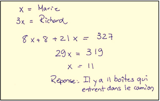 Cette résolution fictive a été rédigée afin d’ouvrir à divers éléments sur lesquels les élèves peuvent réagir, mais aussi pour susciter l’engagement de l’élève-résolveur dans sa propre résolution. Ainsi, Renaud choisit comme inconnue « x » pour « Marie ». L’inconnue est nommée par le nom de la personne au lieu de préciser que « x » est le nombre de boîtes que peut contenir la voiture de Marie, sans compter celle du toit. Renaud fait le même type d’identification pour le nombre de boîtes que peut contenir le camion de Richard. De plus, il écrit le signe d’égalité lors de l’identification des inconnues au lieu des deux points. Par ailleurs, dans la production de Renaud, la relation multiplicative est bien menée lors de l’identification du nombre de boîtes que peut transporter le camion de Richard à chaque aller. En ce qui a trait à la mise en équation, celle-ci est correcte, mais plusieurs étapes et opérations sont implicites.